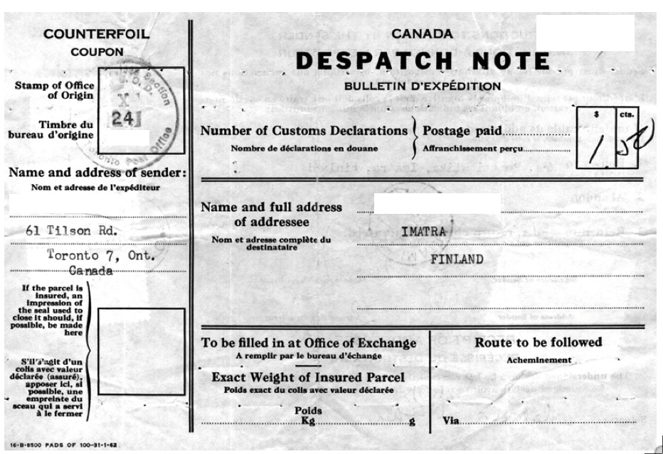 Before modern technology, people used what were known as «parcel cards». There were basically two types. One was very official from the post office, properly known in English-speaking countries as “parcel dispatch notes”. Back in the 1800s, French was quite often the language of diplomats and the bourgeoisie, and since they were the only ones with enough money to send parcels, the term “bulletin d’expéditon” was also in common use, especially in Europe. These official cards were introduced after the establishment of the international parcel service by the Universal Postal Union on 01 October 1881. (Great Britain, India, The Netherlands and Persia, 1 April 1882). These “approved” forms generally gave details of preferred routing, weight, size, postage paid (or to be collected), and the addresses of the sender and recipient. The recipient was supposed to sign the form, which was then returned to the “exchange office” in the country of origin. One source I read says that in Canada, these parcel cards were generally “left to rot” and were ultimately thrown out – they are consequently extremely rare. In European countries on the other hand, they were often sold to specialist collectors. Below are shown two typical parcel dispatch notes both fairly recent, the first Canadian and the second from Italy. ![]() ![]() There was also a second type of parcel card that was used on rarer occasions, those printed by the company who sent the package. Although the words “parcel card” were sometimes used, they were sometimes simply called post cards so that these private cards would not be confused with official cards, If the term “parcel card” as such is not inscribed, this usage is however generally revealed by an inscription on the top of the card saying “Return card” or something like “Please acknowledge reception by retuning this card”. There are apparently very few of these around. The example shown was returned on 21 May 1942 from CAPO 2, which means Canadian Army Post Office no 2 in Gander during World War II. ![]() The front of this parcel card is in itself interesting. It comes from the Frontenac Brewing Co. in Montréal that no longer exists. It has no stamp but still was franked by the post office. Also, we can see that while it was not a sealed envelop with hidden contents, it was still passed by a censor on 20 May 1942, the day before it left the post office. The reverse side shows something unusual - one would have thought that the brewery would have sent beer but that does not seem to be the case. In fact, it says “Thanks for the cigs!”. The person who replied was a private from Headquarters Company, Prince Edward Island Highlanders. CAOS means Canadian Army Overseas, which was the case of Newfoundland in the pre-1949 world. ![]() As a side note, the PEIH is now a Reserve Force armoured reconnaissance unit (Prince Edward Island Regiment). Several months after this parcel card was returned, on the night of 13/14 October 1942, the Newfoundland Railway ferry, S.S. Caribou, was sunk off Port-aux-Basques by the German submarine, U-69. Among the passengers that night were 9 members of the Prince Edward Island Highlanders. Six of them did not survive. I hope our chap wasn’t among them. (I though did check through the Canadian Legion death records and found nothing). |