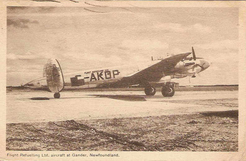 Some years ago I bought a postcard showing what looked like a Lancaster bomber in Gander that looked strange and had a civilian registration number to boot. I reckoned it was probably just some airplane passing through. On looking at it more closely, I saw the name "Flight Refuelling" and decided to follow the trail. ![]() But before going any further, I must firstly say thanks to a great group of people. The international company Cobham plc, based in England, is now the parent company of Flight Refuelling Ltd (FRL) who owned the airplane on the postcard. Cobham is engaged in the development, delivery and support of aerospace and defense technology and systems. A first thank-you goes to Philip Smart, Brand and Digital media Manager, who so very kindly piloted all my requests for info. Colin Cruddas, archivist with the Cobham archives, was helpful to the point of even giving me access to sections of a then unpublished book on in-flight refueling by Brian Gardner. Their information and that from many other sources tells the story - and quite a story it is! Early attempts at long distance flight The vast majority of airplanes developped between the two world wars were capable of flying only short distances. Many different techniques were used to enable planes to fly farther, including low-drag steel monocoque skins instead of wood or fabric, sleeker design, larger fuel tanks (which could sometimes be jettisoned) and more efficient engines. It should be noted however that gradually, the real objective was no longer to increase distance but rather the payload. Imperial Airways flying boats were already able to fly a transatlantic service via Ireland and Botwood, Newfoundland, but only with a heavy fuel load and therefore very much smaller payloads. While work went on to modify individual aircraft, another possibility envisaged was the "piggy-back" or "composite" solution, using two airplanes. The Short-Mayo composite project in Great Britain combined an S.20 seaplane, called Mercury, and a larger S.23 C flying boat, named Maia, which had been modified to accommodate Mercury atop its fuselage. On 21 July 1938, the composite took off from Foynes, Ireland, with the Maia flown by Capt Wilcockson and Mercury by Capt D C T Bennett (two well known names in Gander's history). It was a successful twenty-hour twenty-minute non-stop flight to Montreal with half a ton of mail, newspapers and newsreels. The composite was used successfully for cargo, but was considered too dangerous for carrying passengers. The following website shows it all, with the added benefit of being able to see Bennett "in person" : In the meantime, mid-air refueling was being looked at as a possible solution - and it had humble beginnings! The first real attempts were in 1921 when a U.S. Huff-Daland HD-4 used a grappling hook to snag a 5-gallon gas can from a float. In another case, a wing walker, with a gas can strapped to his back, climbed from one airplane to another to pour gas into the aircraft’s tank. Gravity-fed refueling came along in 1923 when military pilots in San Diego used one bi-plane, a Havilland DH-4B, to refuel a second using a 50-foot hose made of rubber - somehow not getting the hose caught up in the prop or dousing themselves with aviation gas! ![]() In the US, the best known testing was done with the airplane "Question Mark", a tri-engine Fokker C-2. The flight lasted from 01 to 07 January, 1929; a total of 150 hours and 40 minutes, including a flight over the New Year’s Day Rose Bowl football game. During the flight, they made 43 contacts with the tanker aircraft, each contact lasted about 7 1/2 minutes, with the aircraft about 15 to 20 feet apart. The two refueling aircraft alternating in the operation were Douglas C-1 single-engine bi-planes with a refueling hose passed through a hatch cut in the floor. During the refueling contacts, the tanker crews also passed oil, food, water and other miscellaneous items, by means of a rope. Pre-war in-flight refuelling In-flight refueling research continued as well in other countries, particularly Great Britain. In the early 1930s, Lt. Richard Atcherley of Britain’s Royal Air Force devised a new approach wherein the tanker trailed 300 feet of line with a grapnel hook at the end, which then hooked a 100 ft weighted line dangling from the receiving aircraft. Atcherley’s “crossover” method, patented in 1935, was purchased by Flight Refueling Limited, headed by Alan Cobham, who had been knighted for his work on civil aviation. The company received support from Imperial Airways and in the late 1930s developed what came to be called "the looped-hose" method. Here the receiving airplane pulled a weighted line with a grapnel hook at the end. The tanker flew alongside and literally fired its own hooked line across the other to entangle the hooks. The line was first drawn back into the tanker where the receiver's cable was then connected to the refueling hose. The receiver then hauled back in its own cable bringing the hose with it. Once the hose was connected, the tanker climbed sufficiently above the receiver aircraft to allow the fuel to flow under gravity. Because the tanker flew above, ahead and slightly starboard (right) of the receiver, it would normally be difficult to see what was going on. For this reason, large windows were added to the port (left) side of the tanker's fuselage as shown below: Without the