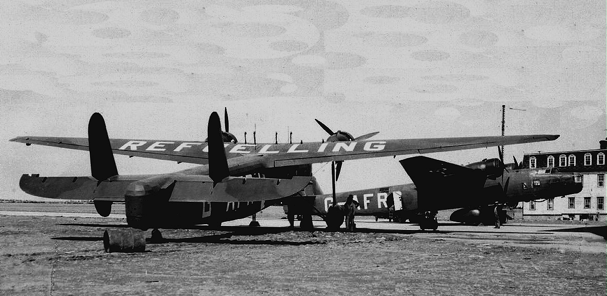 ![]() In February/March 1939, these bombers were given British Civil Registrations as G-AFRL, G-AFRG and G-AFRH. They were equipped with the extra internal fuel tanks of 1000 Imperial gallons, impressive for the time. The tanker G-AFRL was based at Rineanna (Shannon), Ireland and the two other Harrows were shipped as deck cargo to Montreal on the steamer SS Bedford which was part of the Canadian Pacific Shipping Line. They were then uncrated and reassembled in Longueuil, the Fairchilds Aircraft base, and were then flown to “Newfoundland Airport”. Spare parts were also sent to Gander, so the aircraft and team were fairly self-sufficient, though for a part of the time a railway boxcar was used as accommodations. ![]() Harrow FRH with the Administration Building in the distant bavkground A very nice still photo of an in-flight refueling operation can be seen here; An absolutely splendid video of a Flying Boat being refueled by a Handley Page Harrows can be seen here, a beautiful thing to watch ! But before this advance could change commercial travel, the Second World put an end to trans-Atlantic commercial flying. The three Harrow tankers did not stay around for long. The tanker based in Ireland G-AFRL was returned to Ford Aerodrome, Littlehampton, Sussex, UK, where it was destroyed by a Luftwaffe bomber attack on August 18, 1940, along with other aircraft of the Flight Refuelling fleet. The two tankers in Newfoundland were kept in Gander for a number of tasks but mainly to be used in runway snow-clearing experiments and landing trials on compacted snow. ![]() Post-war in-flight refueling During the war, U-boats lurked in the mid-Atlantic gap, beyond the normal operational range for most aircraft. One possible answer was to burden Lancaster bombers with a large 1,200 gallon saddle tank. See the photo below of a typical saddle tank installion: ![]() Sir Cobham was sure that mid-air refueling services would again be required as commercial flying recommenced after the end of World War ll. He therefore decided to use these these same Lancasters in another way. In April 1946 the British Ministry of Supply had four former RAF Lancaster B.Mk.IIIs registered as G-AHJT to G-AHJW, and supplied them to Flight Refuelling Ltd, at the Ford Aerodrome in the UK. They were converted into two pairs of tanker/receiver and were used to perfect the company's refueling techniques. FRL itself operated the tankers while a civilian airline flew the receivers, with a frequent rotation of pilots so as to give practice to as many as possible. The main trials were conducted over the south of England in the winter of 1946-47 and simulated mid-ocean refueling. Rather than being like the "Visual Flight Rules" operations that were conducted pre-war, these were all-weather, day-and-night operations, and involved distant interceptions that called upon radar and modern radio communications such as transponders. Each Lancaster tanker could deliver approximately 2,800 U.S. gallons and by now was using a FRL design breakthrough which consisted of the probe/drogue method. The tanker merely trails a hose with a stabilizing drogue on the end. This also serves as a conical guide for a rigid forward-pointing pipe or probe of the receiver aircraft. Put more simply, it looks like a hose with a funnel on the end that a probe of the receiving airplane slips into. This method is universally used today. In early 1947, these trials were expanded to include runs between London and the Bermudas. Later that year, FRL, in association with British Overseas Airlines Corporation (BOAC,) started winter refueling trials. For these operations, FRL bought four “Lancastrians” from Trans-Canada Airlines and converted them to tankers. During the war, some Canadian built Lancaster bombers were converted into “Lancastrian” passenger carrying airliners, especially prized because they were fully winterized. Below is a typical TCA Lancastrian passenger/cargo aircraft: ![]() Two Lancastrian tankers were based at Shannon with one at Goose Bay and the other at Gander. For the trials, the receiver was a B–24 Liberator that BOAC had converted to cargo. Because of help from the prevailing winds, for an eastbound flight, only one mid-air refueling was necessary, generally when the Liberator had passed 200 or so miles east of Gander or Goose Bay as the case may be. Two refuelings, one at each end, were required for the westbound trip. Between February 4 and May 30, 1948, fifteen flights each way were served by mid-air refueling, permitting the Liberator to fly nonstop - 3,240 miles - from London to Dorval. The actual